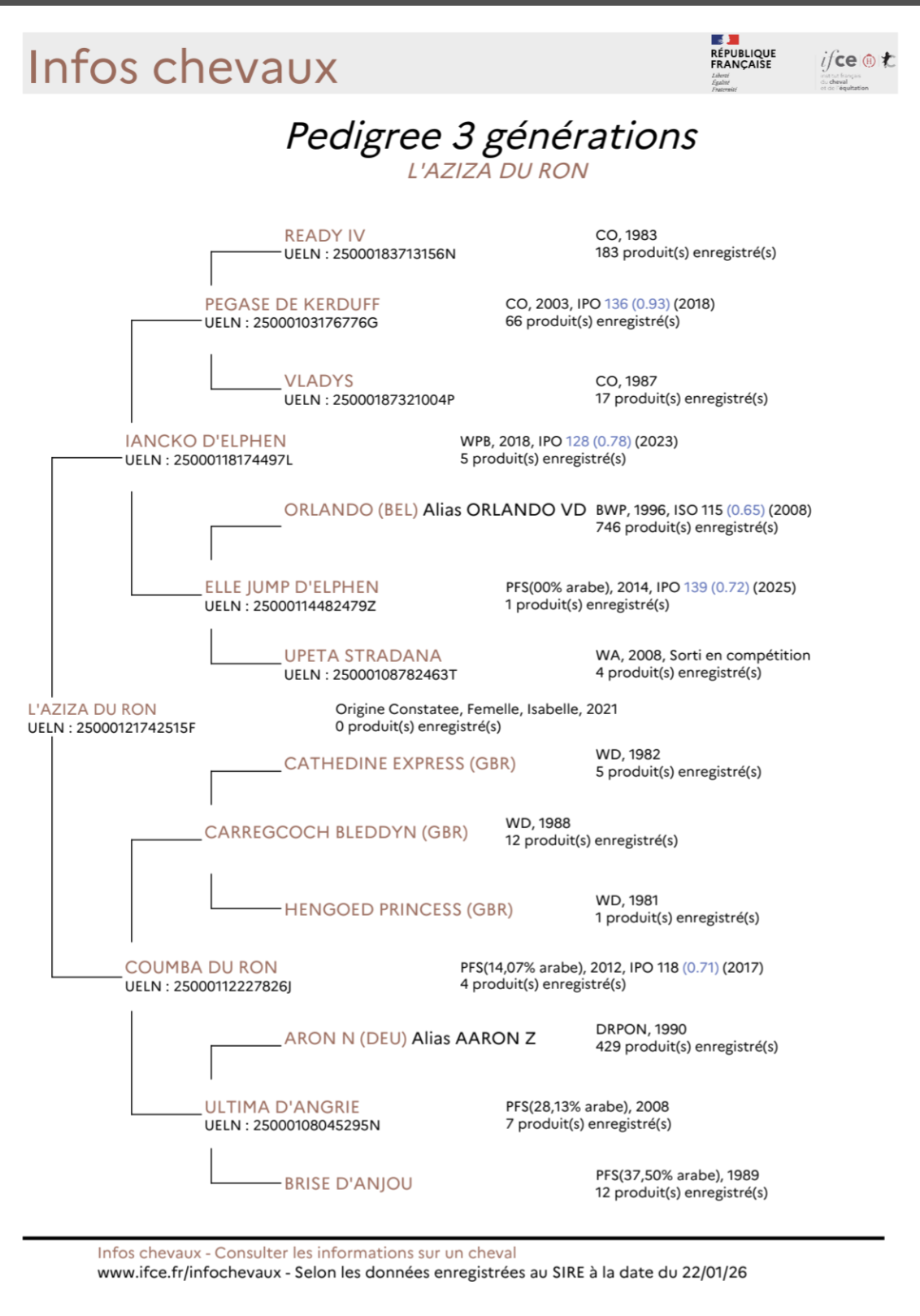 Voir la fiche IFCE de L’AZIZA DU RON.